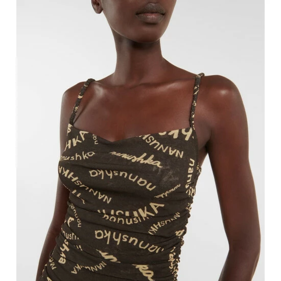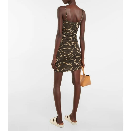 Covered with a logo print, the Adie minidress from Nanushka combines a minimalist silhouette and contemporary patterns. It’s fully made from recycled materials and is gathered at the sides for additional volume.