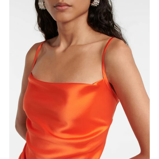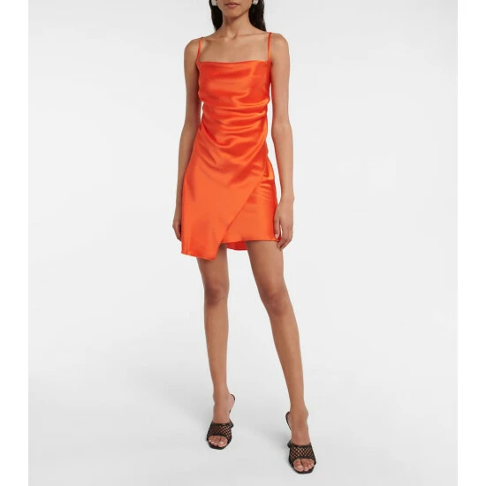 Cut from glossy satin with a mini-length, the Emila slip dress is ideal for nights out. It has an elegantly draped and wrap-over silhouette that grazes the thigh and secures with adjustable spaghetti straps.
