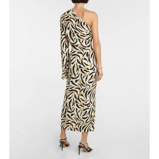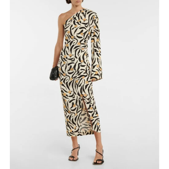 Nanushka’s Florence midi dress is shaped with a contemporary one-shoulder neckline, fluted sleeve, and wrap front for a stylish, fluid drape. It’s distinguished by a floral and animal print for your daily dose of flair.