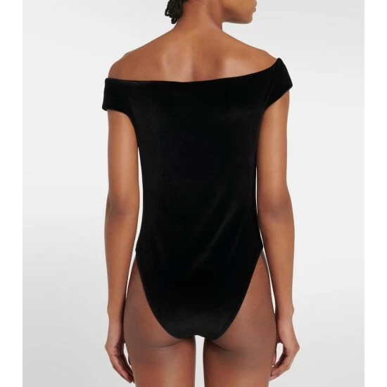 Composed with a tactile focus on the form, Nanushka reinvents the classic off-shoulder silhouette with seamless ease. Made from stretchy velvet, this Gesa bodysuit has a curved neckline and a ruched bodice.