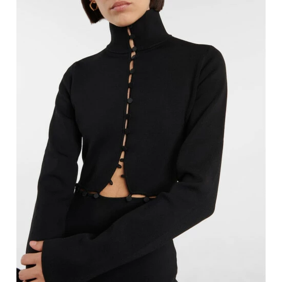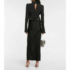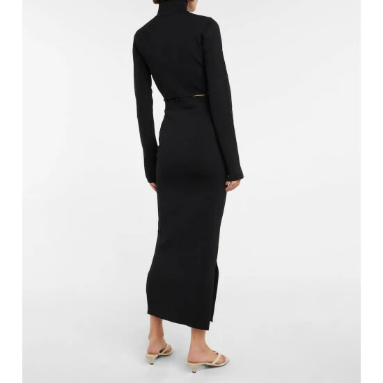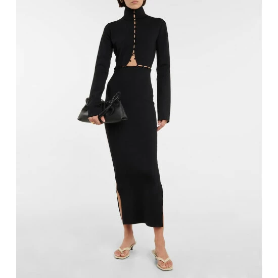 The Kaida midi dress from Nanushka is cleverly constructed, with buttons and loops connecting parts of the dress. It’s made from a matte smooth black fabric, and features a high neck and long sleeves.