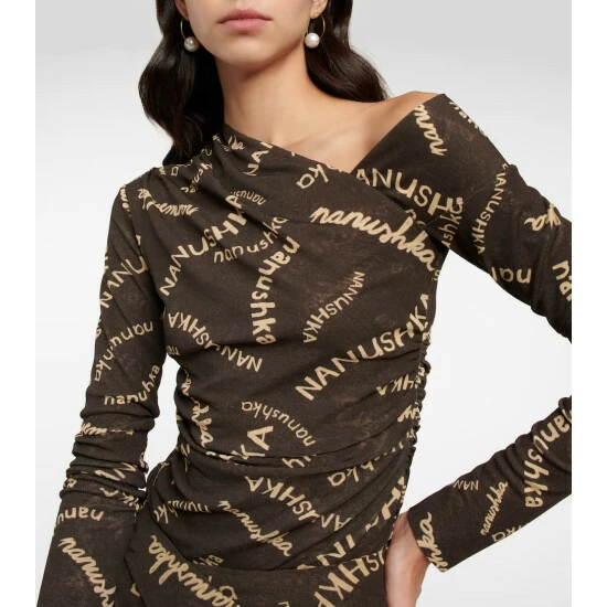 Nanushka devotees will love donning the asymmetric Lumy top. Cut from mesh jersey to reveal one shoulder, the long-sleeve style features an all-over hand-drawn logo print and gentle ruching at the waist.