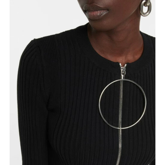 This cropped cardigan from Paco Rabanne is designed with a retro flare that is reminiscent of the brand’s ’60s origins. Rib-knitted from stretch-infused cotton, it has a slim-fitting silhouette and an extra large O-ring on the top zipper.