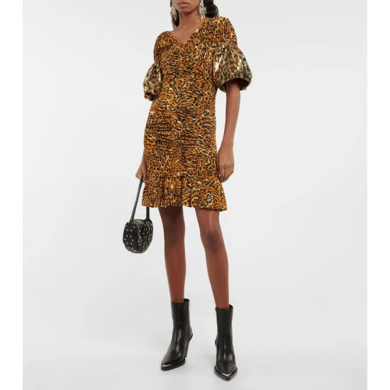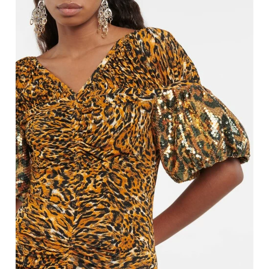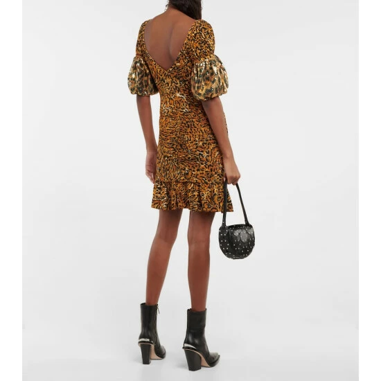 Paco Rabanne offers a fresh take on animal print with this ruched minidress. It has a fitted silhouette with a ruffled hem and clear sequin embellishments on the sleeves.