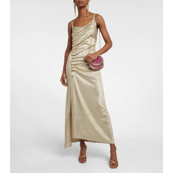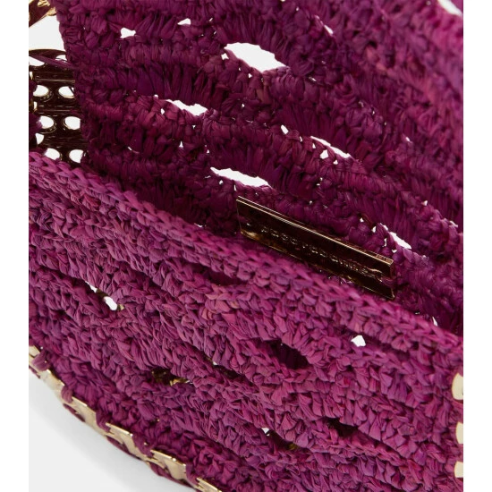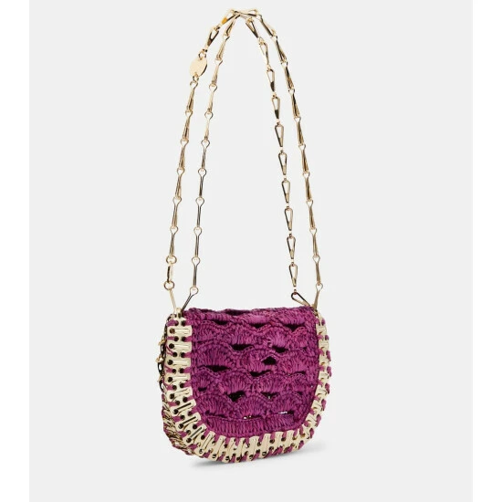 This shoulder bag from Paco Rabanne proves that accessories can be casual and glamorous at the same time. This open-work raffia design is trimmed with brand-iconic 1969 golden metallic dots delicately embroidered by hand.