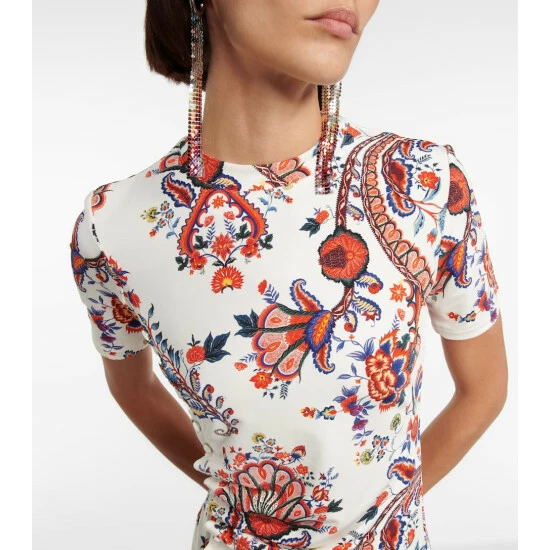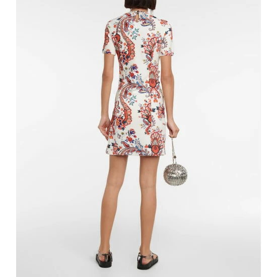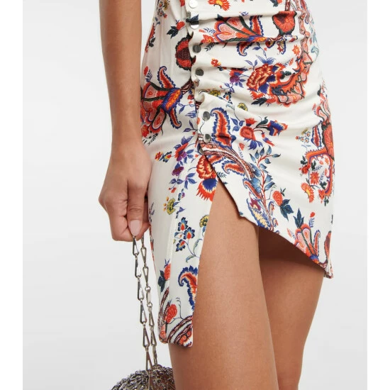Add some energy to your edit with this floral paisley minidress by Paco Rabanne. It features a fitted bodice and ruched skirt, accented with polished silver buttons and an asymmetric jutted hemline.