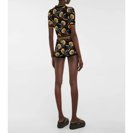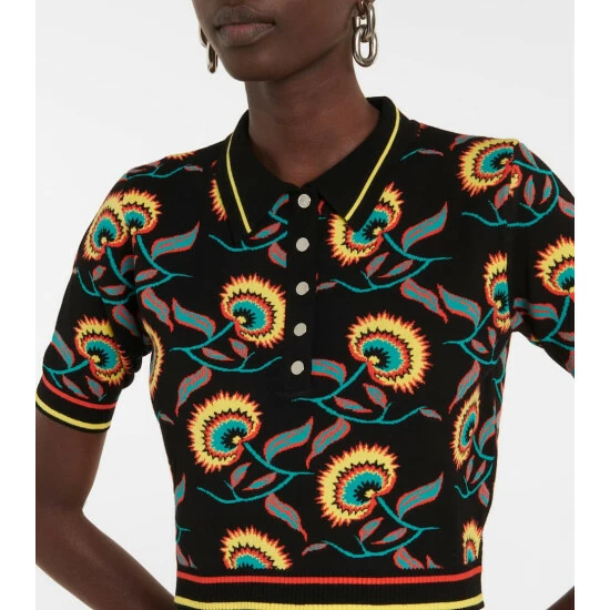This cropped top from Paco Rabanne features a vibrant floral jacquard motif lending it a retro feel. It’s finished with a collar and a buttoned front.