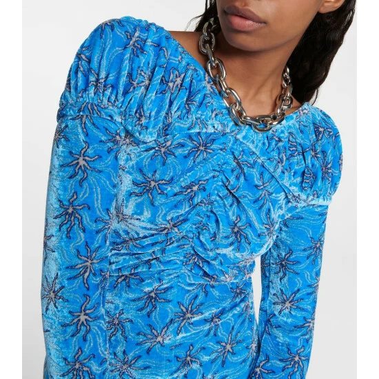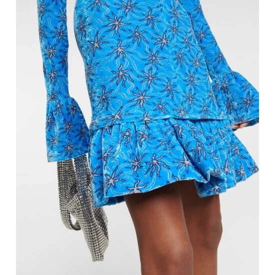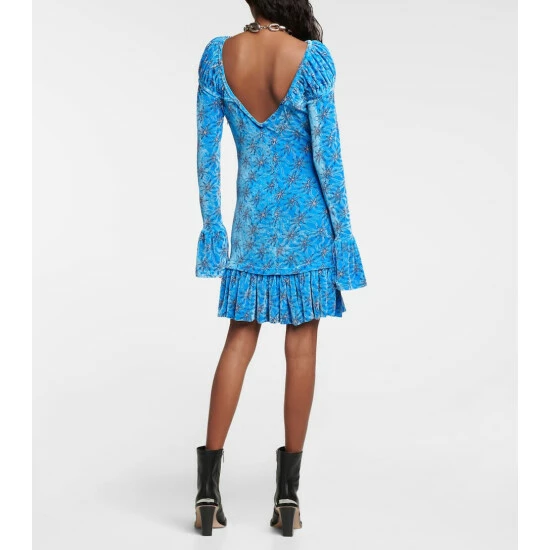 This minidress from Paco Rabanne is made from floral velvet and threaded with shimmering metallic yarns. Designed for a skintight fit, the V-neck style is accented with ruching at the front and ruffle trims.
