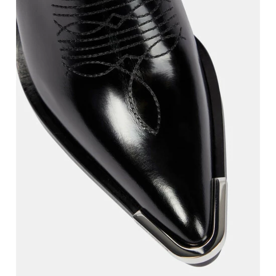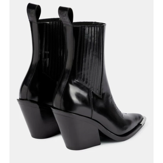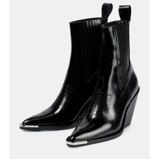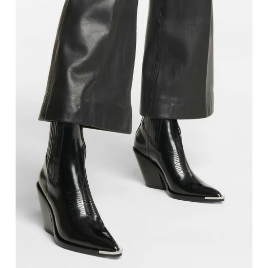 These ankle boots from Paco Rabanne have a cowboy-inspired aesthetic. Made in Italy from glossy black leather, they feature tonal topstitching and pointed toes with hardware accents at the welt.