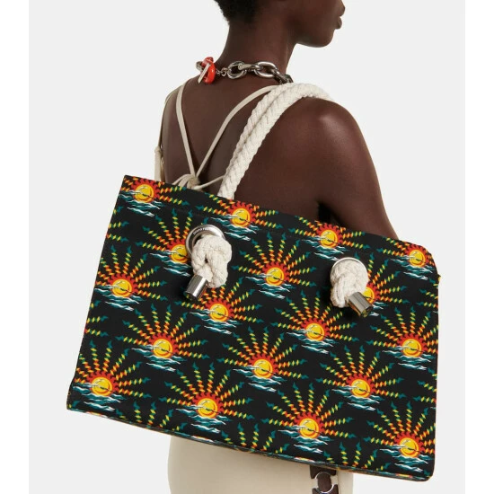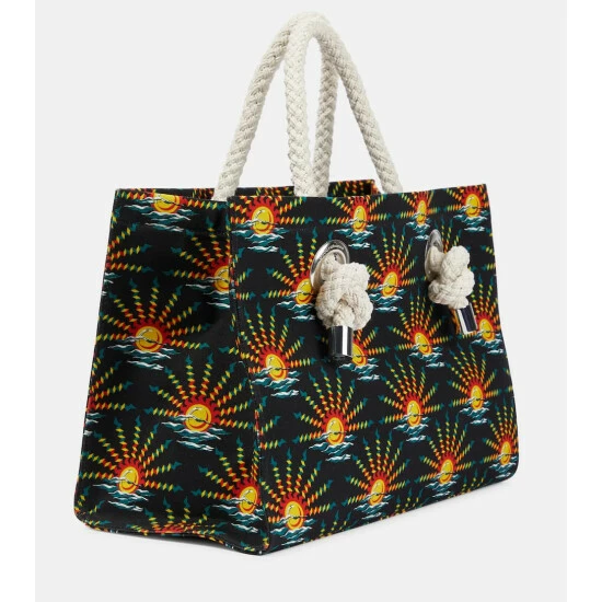 This tote bag from Paco Rabanne’s offering of summer-ready accessories is printed with a colorful sunray motif. Made from sturdy canvas, it has braided rope handles.