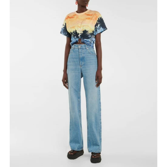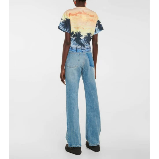 This crop top from Paco Rabanne features tropical-inspired sunset and palm tree print. Made from cotton, it’s gathered at the hem with a ring detail
