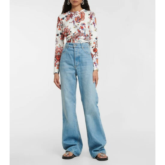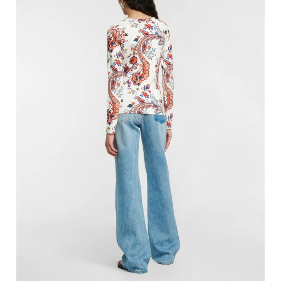 Make a stylish statement in this floral and paisley-print long-sleeved top from Paco Rabanne. Made from jersey, it has silver-tone, logo-engraved buttons and ruched detailing.
