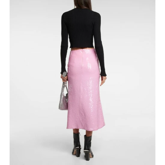 Covered with candy pink sequins, this midi skirt from Paco Rabanne is made for the dancefloor. The gleaming embellished style features ruched detailing at the dropped waistband, golden buttons, and an asymmetric split hemline.