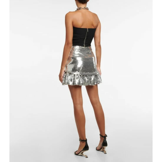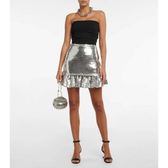 This miniskirt is covered in shiny metallic sequins that mimic the chain-linked discs so commonly seen on Paco Rabanne’s designs. Fully lined, it has a dropped, frilled hem.