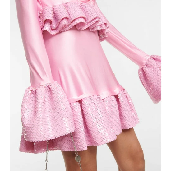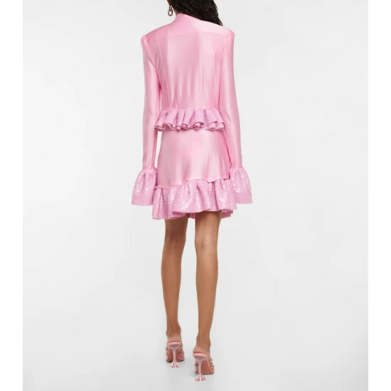 This Paco Rabanne top accentuates the figure with ruching through the bodice and a ruffled peplum hem. A playful profusion of sequins further enriches the pink satin design.
