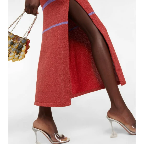This Paco Rabanne maxi dress is crafted from a lightweight knit threaded with fine metallic yarns to achieve a shimmering finish. The style features a ribbed high neck and a red and purple striped motif.