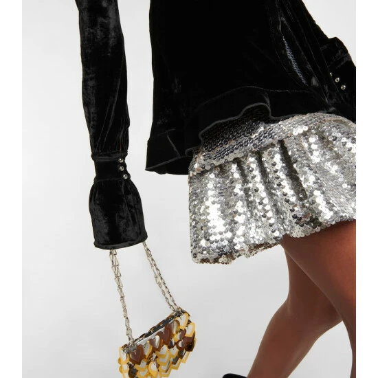 This velvet top from Paco Rabanne has a fitted silhouette with cuffed bell sleeves, a stand-up collar, and crystal embellished buttons. This style includes detailing on the back from gathered fabric, and a frilled hem.
